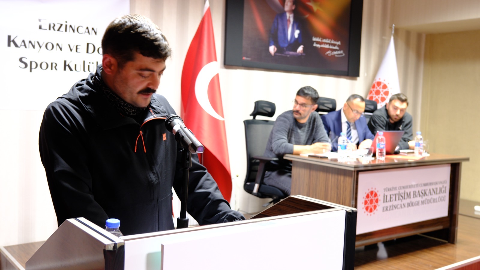 Kemaliye Kaymakamı Emirhan Arıkan ise; “Tabii ben de yaklaşık 4 ay oldu Kemaliye’yi atanalı. Erzincan’a ilk kez geldim. Lakin tabii ki biz Erzincan’ı, Kemaliye’yi hep duyuyorduk turistik olarak ama buranın doğa sporları açısından bu kadar zengin olduğunu bizler de bizzat deneyimleyince fark ettik. Özellikle Kemaliye’de daha geçen yıl Sayın Bölge Müdürümüz bir ekiple geldiler. Dediler ki Sayın Kaymakamım biz böyle bir şey yapmak istiyoruz. Dedim ki tabii ki. Seve seve biz ne yapabiliriz aslında? Bir ihtiyacınız var mıdır yok mudur? Sonrasına da emin olun parkur bitirene kadar sürekli içinde kalmaya özen gösterdik. Tabii ki turizm ülkemizde sadece deniz turizminden ibaret olarak algılanıyordu ve bu algı yavaş yavaş son on yıldan beri yıkılmaya başladı. Kendim de zaten Antalya Alanyalıyım, deniz turizmiyle büyümüş bir insanım. Erzincan’a da geldikten sonra, dedim demek ki turizm denizden ibaret değil. Evvela doğa sporları, tarih turizmi, ekstrem sporları, turizmi. Şimdi Kemaliye’de de Sayın Bölge Müdürümüzz ve ekibinin yaptığı tespitlerle beraber 4 ya da 5 tane farklı derecede kanyon tespit ettik. Tabii ki şu an aslında en çok bilinen karanlık kanyon. Ama biz karanlık kanyonu sadece tekne seyahatinde kullanıyoruz. Kanon yapıyor bazı misafirlerimiz. Bu işe, bu yeni kanyonlar işte, Dirli, Ergün, Aslanova, Çavuş, Yeşilyurt kanyonları birazcık daha seviyelerinin farklı olduğu ve aslında insanların kendi sınırını keşfedebileceği kanyonlar. Şöyle söyleyeyim, ben de tabii ki bu oluşumdan evvel Kemaliye’dede birazcık daha kendimi doğa sporlarına hobi edinmeye karar vermiştim ve trekking zaten yapıyordum. Trekking’in ardından bilmiyorum biliyor musunuz? Kemaliye’de, Demir parkuru vardır. Yaklaşık 517 basamaklı. Bir 500 metrelik tırmanma parkuru vardır. Böyle 5 ya da 6 saatlik sürer. Geçen yıl onu yine az önce Bölge Müdürlüğü’nün bahsettiği Wingsuit atlayışı yapan eğin kuşu dediğimiz Cengiz Koçak vardır. Cengiz Koçak’la beraber tırmandım. İkinci kez tırmandım. Onunla sohbet ettik. Ya dedim tehlikeli değil mi birazcık? Dedi ki bana, sayın kaymakamım tehlikeli spor yoktur, tehlikeli ve bilinçsiz sporcu vardır dedi. Aslında kanyon yürüyüş, kanyon turizminde de, kanyoningde de bizim aşmaya çalıştığımız bu. Bu kulübü sayesinde birazcık daha kitleye bu işin yapıldığını, bu işin eğitimle çok güzel yapıldığını göstermek istiyoruz. Çünkü Ha deyince yürünmüyor arkadaşlar. Biz bu spor kulübü sayesinde özellikle gençlerimize belli bir eğitim verip sınırlarını hissetmesini istiyoruz açıkçası. Umarım bu kulüp az önce Sayın Kaymakam da dediği gibi hayırlara vesile olacak. Erzincan’da Kemali’ye ve İliç’te hakikaten keşfedilecek çok fazla yer var.” Dedi.