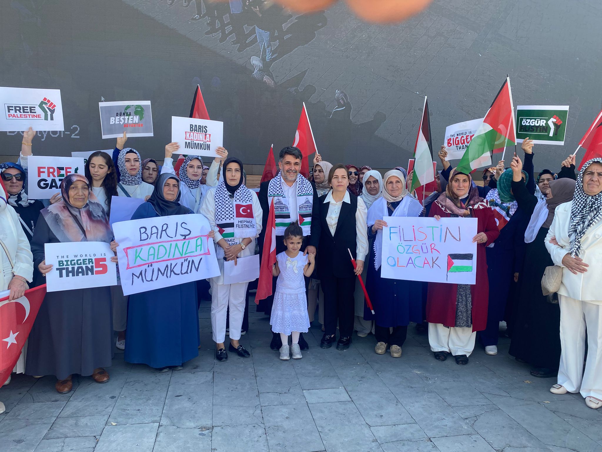 Yüce Rabbimiz mealen “Bir insanı öldüren, bütün insanlığı öldürmüş gibidir. Bir canı yaşatan, bütün insanlığı yaşatmış gibidir.” (Maide, 32) buyuruyor. Gazze, bu ilahi kelamın sarsıcı bir imtihanıdır. Bizler İstanbul’dan, Hakkari’den, Trabzon’dan, Erzurum’dan ve Türkiye’nin 81 ilinden dünyanın dört bir yanındaki kadınlara, kız kardeşlerimize sesleniyoruz: Barış kadınla mümkün! Barışçıl bir şekilde yola çıkan ve uluslararası sularda haydut İsrail’in hukuksuz müdahalesine uğrayan Küresel Sumud Filosu’nu dünya öylece seyretti! Hamdolsun, Türkiye, Cumhurbaşkanımız Sayın Recep Tayyip Erdoğan’ın kararlılığıyla bu adaletsizlik karşısında da sessiz kalmadı.