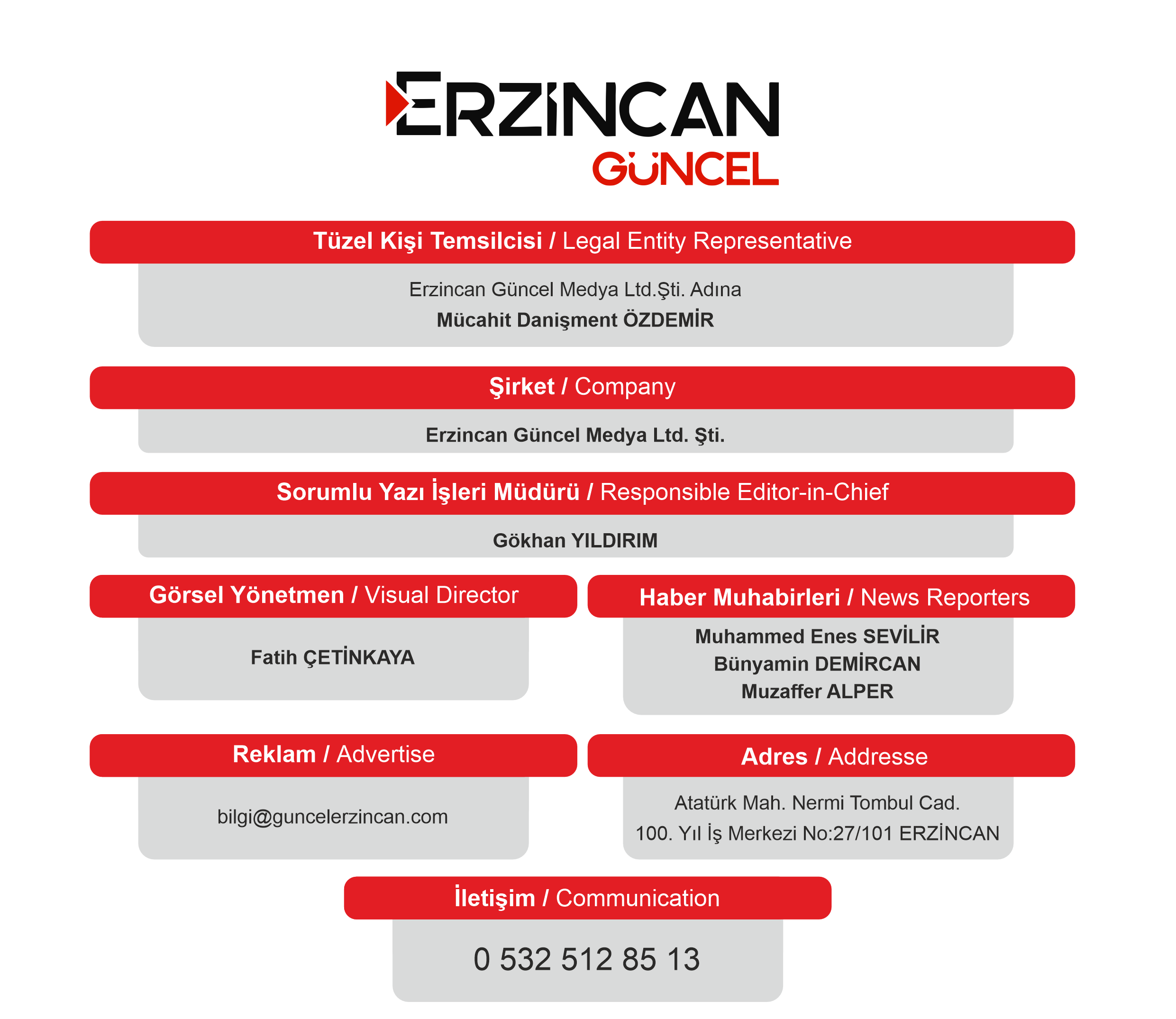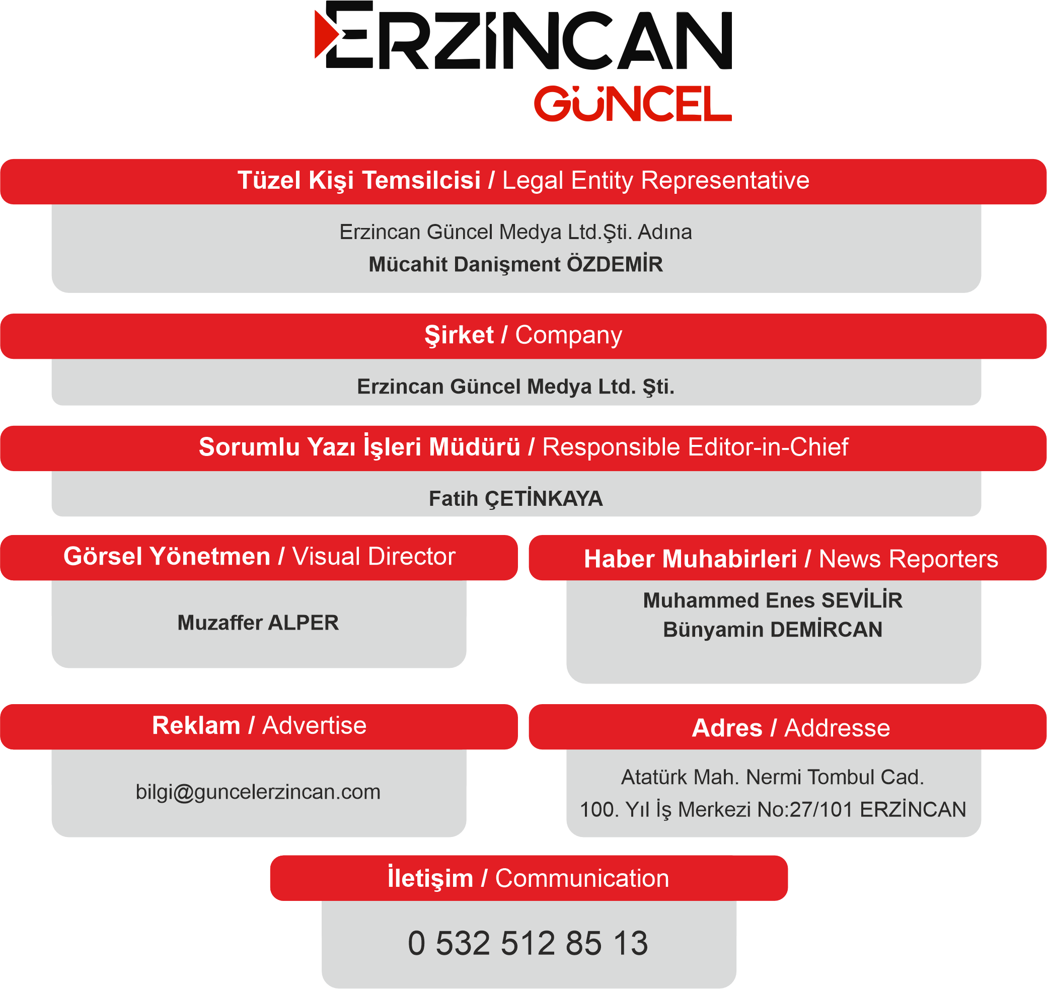 www.guncelerzincan.com tüm hakları saklıdır. Kod, haber, resim, röportaj gibi her türlü içeriğinin tüm telif hakları www.guncelerzincan.com’a aittir. www.guncelerzincan.com sitesinde yer alan bütün yazılar, materyaller, resimler, ses dosyaları, animasyonlar, videolar, dizayn, tasarım ve düzenlemelerimizin telif hakları 5846 numaralı yasa telif hakları korunmaktadır. Bunlar www.guncelerzincan.com’un yazılı izni olmaksızın ticari olarak herhangi bir şekilde kopyalanamaz, dağıtılamaz, değiştirilemez, yayınlanamaz. İzinsiz ve kaynak belirtilmeksizin kopyalama ve kullanımı yapılamaz. www.guncelerzincan.com’daki harici linkler ayrı bir sayfada açılır. Yayınlanan köşe yazısı ve yorumlardan yazarları sorumludur. www.guncelerzincan.com’da hiçbir bildirim yapmadan, herhangi bir zaman değişikliğe gidebilir.