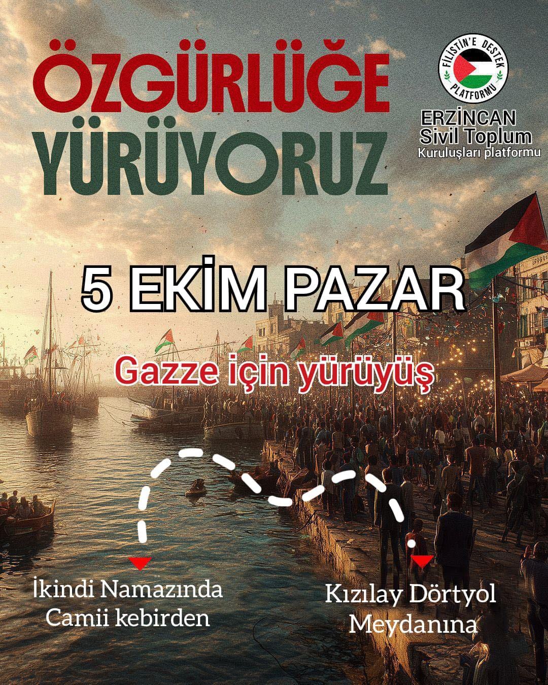 Filistin’e Destek Platformu öncülüğünde bir araya gelen sivil toplum kuruluşları, Filistin halkına destek amacıyla yarın Erzincan’da yürüyüş düzenleyecek. “Özgürlüğe Yürüyoruz” sloganıyla yapılacak etkinlik, ikindi namazının ardından Camii Kebir’den başlayıp Kızılay Meydanı’nda sona erecek.