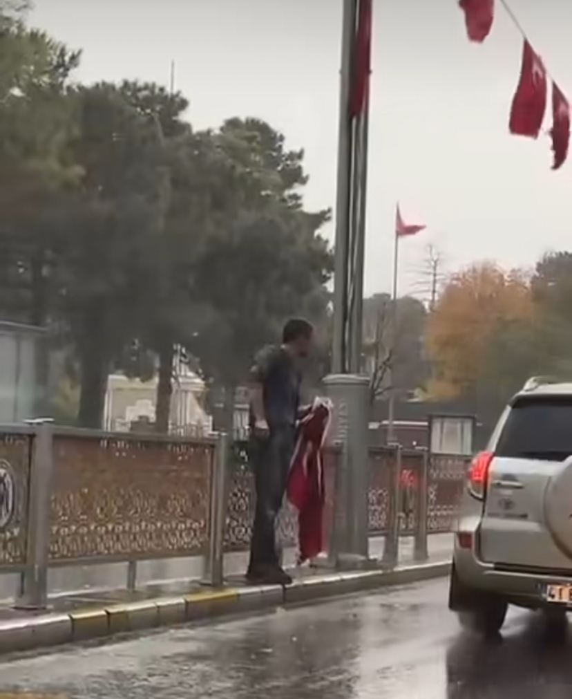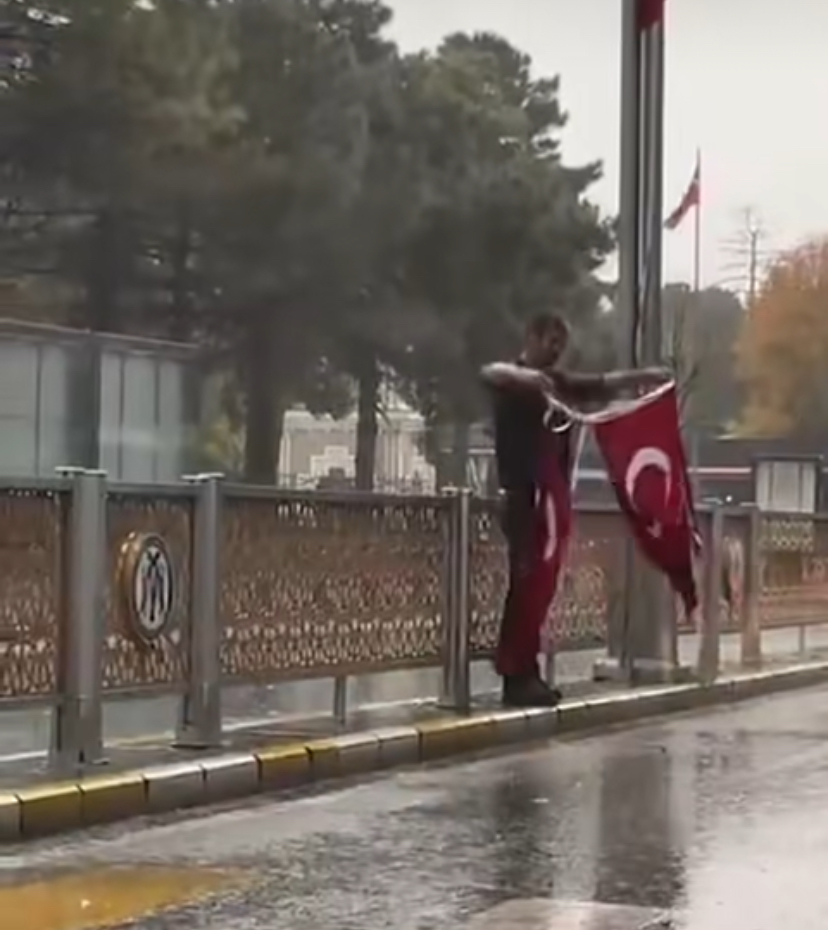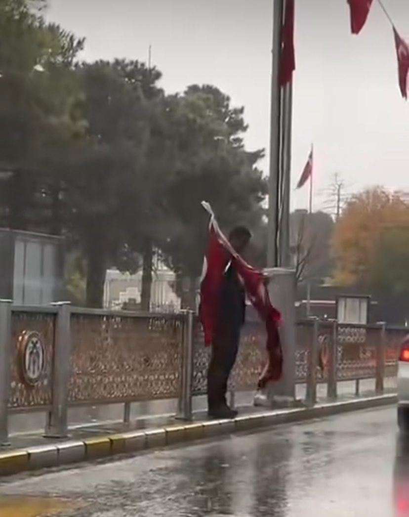 Vatandaşın yağmur altında gösterdiği titizlik ve saygı, bayrağa duyulan sevgiyi simgeleyen anlamlı bir örnek olarak hafızalara kazındı.